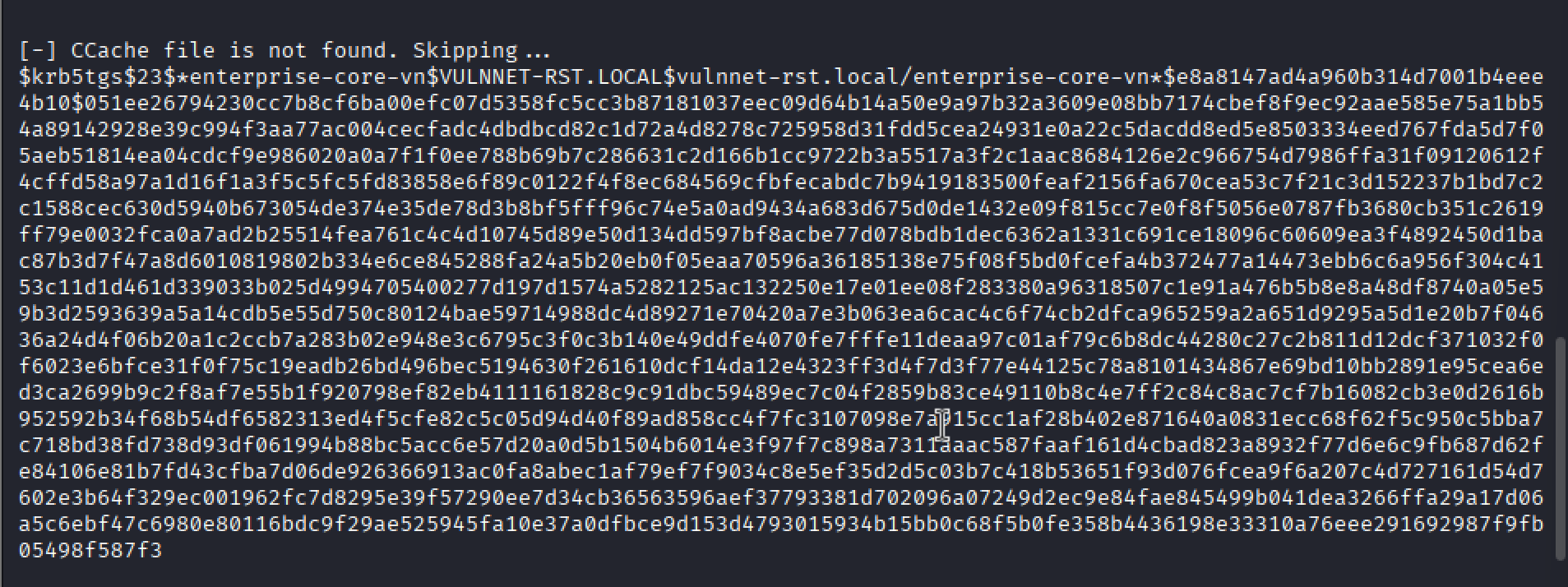 $krb5tgs$23$*enterprise-core-vn$VULNNET-RST.LOCAL$vulnnet-rst.local/enterprise-core-vn*$e8a8147ad4a960b314d7001b4eee4b10$051ee26794230cc7b8cf6ba00efc07d5358fc5cc3b87181037eec09d64b14a50e9a97b32a3609e08bb7174cbef8f9ec92aae585e75a1bb54a89142928e39c994f3aa77ac004cecfadc4dbdbcd82c1d72a4d8278c725958d31fdd5cea24931e0a22c5dacdd8ed5e8503334eed767fda5d7f05aeb51814ea04cdcf9e986020a0a7f1f0ee788b69b7c286631c2d166b1cc9722b3a5517a3f2c1aac8684126e2c966754d7986ffa31f09120612f4cffd58a97a1d16f1a3f5c5fc5fd83858e6f89c0122f4f8ec684569cfbfecabdc7b9419183500feaf2156fa670cea53c7f21c3d152237b1bd7c2c1588cec630d5940b673054de374e35de78d3b8bf5fff96c74e5a0ad9434a683d675d0de1432e09f815cc7e0f8f5056e0787fb3680cb351c2619ff79e0032fca0a7ad2b25514fea761c4c4d10745d89e50d134dd597bf8acbe77d078bdb1dec6362a1331c691ce18096c60609ea3f4892450d1bac87b3d7f47a8d6010819802b334e6ce845288fa24a5b20eb0f05eaa70596a36185138e75f08f5bd0fcefa4b372477a14473ebb6c6a956f304c4153c11d1d461d339033b025d4994705400277d197d1574a5282125ac132250e17e01ee08f283380a96318507c1e91a476b5b8e8a48df8740a05e59b3d2593639a5a14cdb5e55d750c80124bae59714988dc4d89271e70420a7e3b063ea6cac4c6f74cb2dfca965259a2a651d9295a5d1e20b7f04636a24d4f06b20a1c2ccb7a283b02e948e3c6795c3f0c3b140e49ddfe4070fe7fffe11deaa97c01af79c6b8dc44280c27c2b811d12dcf371032f0f6023e6bfce31f0f75c19eadb26bd496bec5194630f261610dcf14da12e4323ff3d4f7d3f77e44125c78a8101434867e69bd10bb2891e95cea6ed3ca2699b9c2f8af7e55b1f920798ef82eb4111161828c9c91dbc59489ec7c04f2859b83ce49110b8c4e7ff2c84c8ac7cf7b16082cb3e0d2616b952592b34f68b54df6582313ed4f5cfe82c5c05d94d40f89ad858cc4f7fc3107098e7a915cc1af28b402e871640a0831ecc68f62f5c950c5bba7c718bd38fd738d93df061994b88bc5acc6e57d20a0d5b1504b6014e3f97f7c898a7311aaac587faaf161d4cbad823a8932f77d6e6c9fb687d62fe84106e81b7fd43cfba7d06de926366913ac0fa8abec1af79ef7f9034c8e5ef35d2d5c03b7c418b53651f93d076fcea9f6a207c4d727161d54d7602e3b64f329ec001962fc7d8295e39f57290ee7d34cb36563596aef37793381d702096a07249d2ec9e84fae845499b041dea3266ffa29a17d06a5c6ebf47c6980e80116bdc9f29ae525945fa10e37a0dfbce9d153d4793015934b15bb0c68f5b0fe358b4436198e33310a76eee291692987f9fb05498f587f3