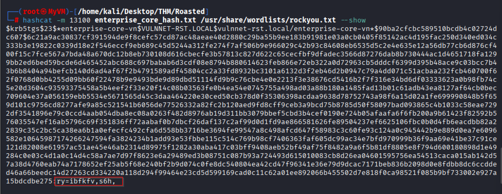 hashcat -m 13100 enterprise_core_hash.txt /usr/share/wordlists/rockyou.txt