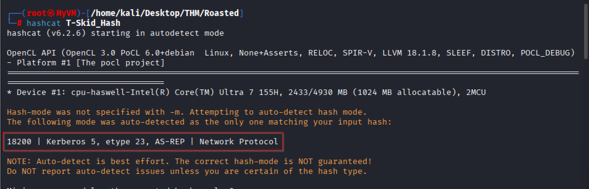 hashcat -m 18200 T-Skid_Hash /usr/share/wordlists/rockyou.txt