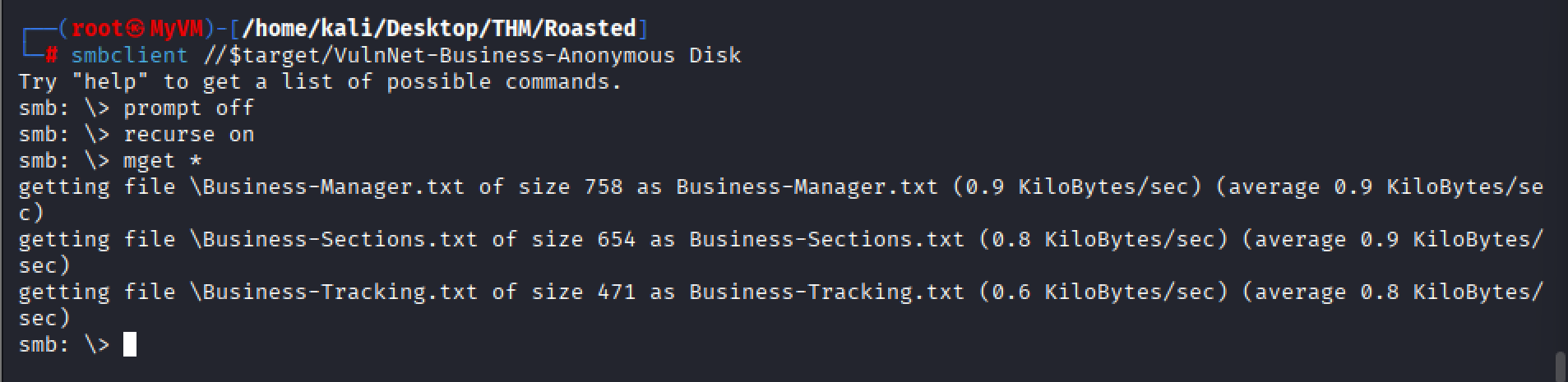 smbclient //$target/VulnNet-Business-Anonymous Diskconnects to the SMB share named “VulnNet-Business-Anonymous Disk” on the target host. This allowed an anonymous sign-in.